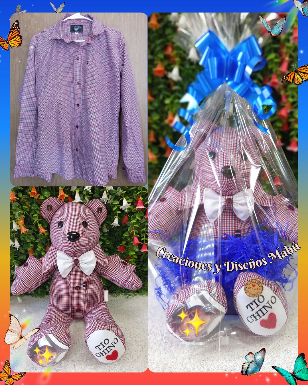 Ya estando aquí, nos la enviaron a nuestro taller para transformarla en un tierno osito memorial tamaño mediano con fotografía y un bordado muy especial 🦋✨