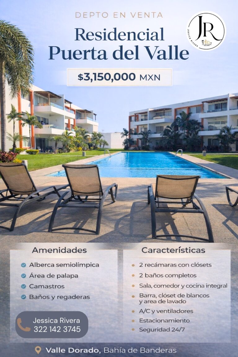 DEPTO EN VENTA / RESIDENCIAL PUERTA DEL VALLE 🌴 $3´150,000.00 MXN 🌟 Amenidades: -Alberca semiolímpica -Área de palapa -Camastros -Baños…